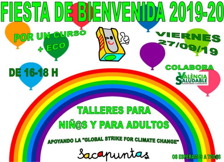 Fiesta de Bienvenida 2019-20 en Sacapuntas. Como tod@s ya sabéis, del 20 al 27 de septiembre se va a realizar la nombrada “GLOBAL STRIKE FOR CLIMATE CHANGE” ( huelga mundial por el cambio climático), secundada por 4638 eventos en 139 países de todo el mundo, y como dice Greta Thunberg ( muy joven y principal activista) “Todos son bienvenidos…todos son necesarios”